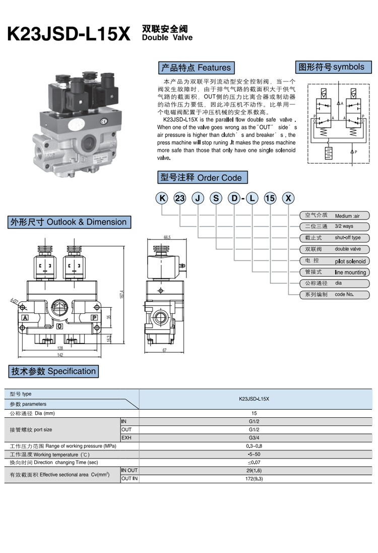 K23JSD-L15L-G/R series double safety valve is a double cross flow safety control valve. Through two groups of spools in parallel structure, it is guaranteed that under the action of equal pilot control pressure, the two groups of spools act synchronously. When the control fails or itself fails, one group of spools is opened and the other group of spools is closed