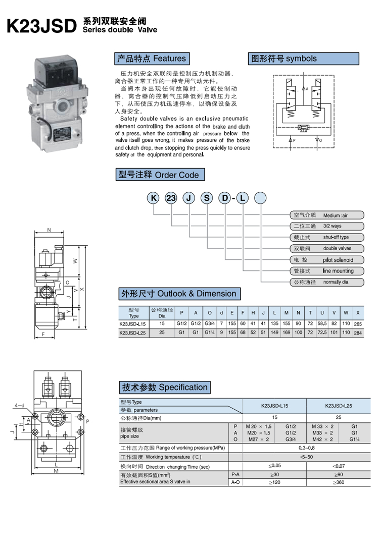 K23JSD series double safety valve, safety double valve for press, product features: press safety double valve is a special pneumatic component that controls the normal operation of the press brake and clutch.