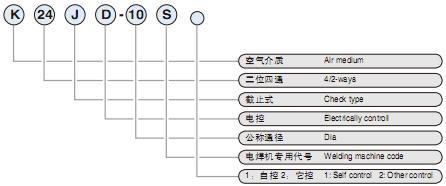 Product features of K24JD-S series two-position four-way solenoid valve KJDS series solenoid valve is a special reversing valve for electric welding machines. Graphic symbol: Model note: Technical parameter: Performanceindexmodel