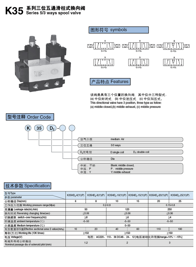 K35H series three-position five-way reversing valve is a three-position reversing valve, which is divided into three types: (a) closed in the middle (b) pressure relief in the middle (c) pressurized in the middle