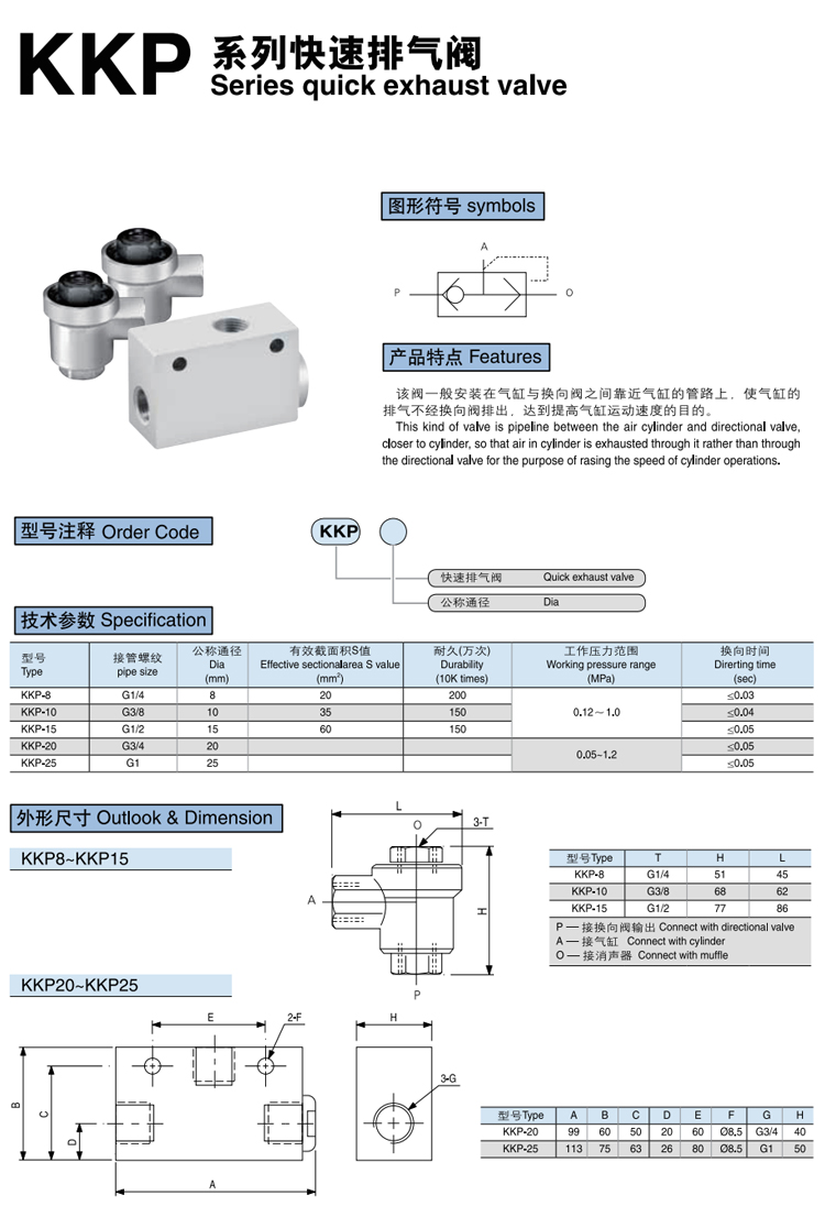 KKP series quick exhaust valve product features: The quick exhaust valve and quick exhaust valve are generally installed on the pipeline between the cylinder and the reversing valve near the cylinder, so that the exhaust gas of the cylinder is not discharged through the reversing valve, so as to improve the movement of the cylinder. purpose of speed.