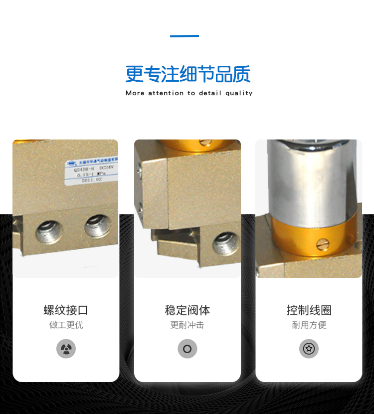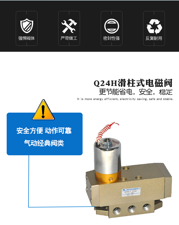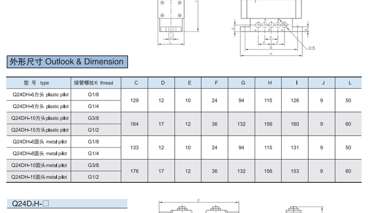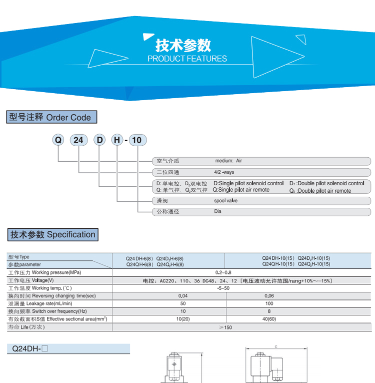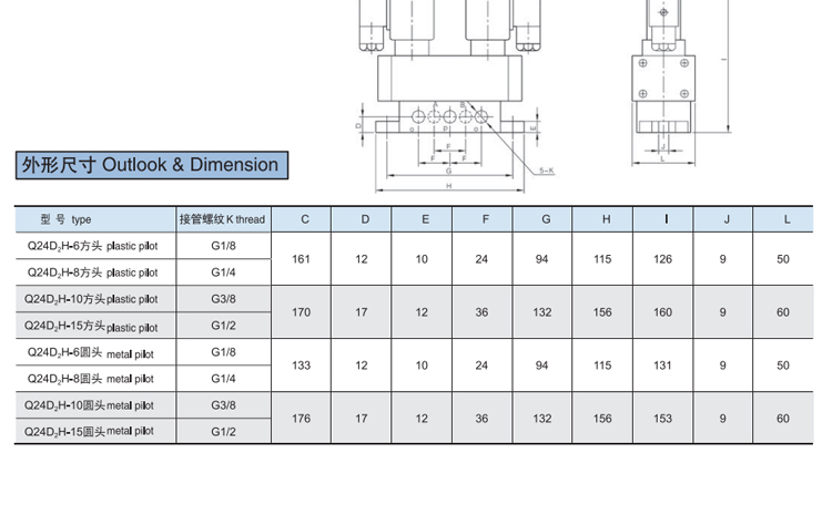 Q24H series two-position four-way lubrication valve product features: The two-position four-way spool valve is the basic element for changing the direction of air flow in pneumatic devices. It is also the oldest traditional product. Graphic Symbol: Model Notes: Technical Parameters: Q24DH-6(8)Q24DH-10(15)Q24DH-20(25)Q24D2H-6(8)Q24D2H-10(15)Q24D2H-20(25) Working pressure (MPa) 0.2-0.8 gas source medium