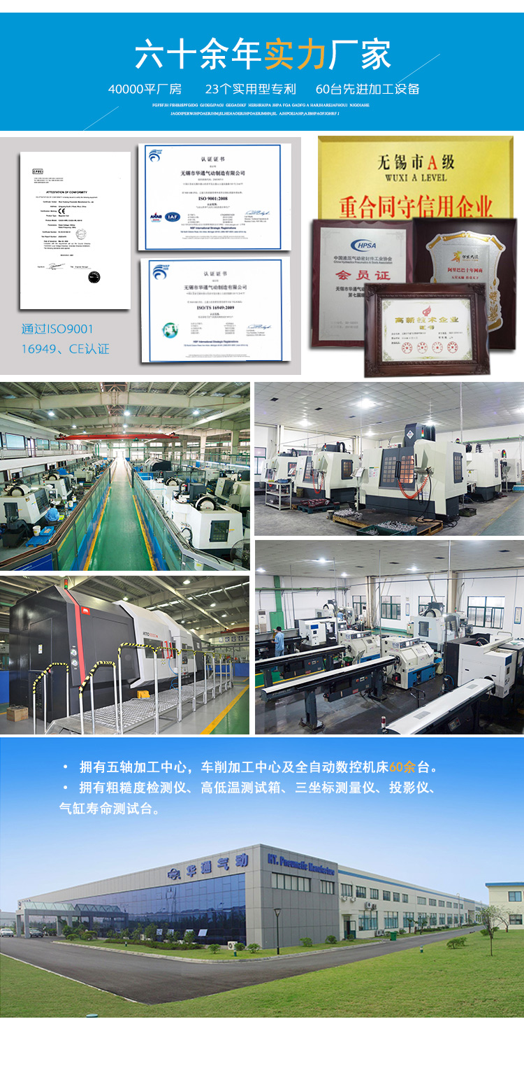 Established in 1956, Wuxi Huatong Pneumatic Manufacture Co., Ltd. is a strong and reliable partner for various industries. With our innovative R&D team, professional technical support team, and motivated sales team, we have been producing and delivering a large number of different valves, cylinders, air-filter components, and accessories to Germany, USA, Iran, Singapore, Russia Federation over 60 years. Huge investments in advanced technology of production and testing equipment, software and organization structure support us to offer top quality and good service. We are committed to be a leading provider and supporter to all our customers.