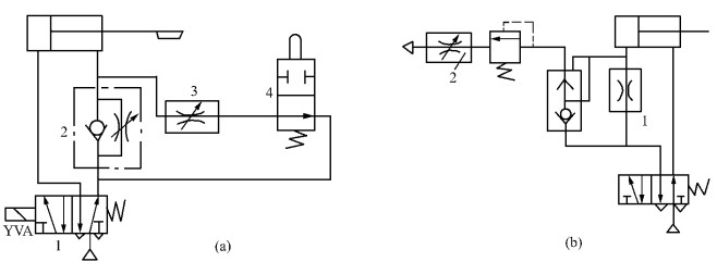 图2所示为两种缓冲回路。图a所示是用机控阀和流量控制阀配合使用的缓冲回路。当气缸伸出运动时,有杆腔空气经二位二通机控阀和二位五通阀排出。伸出运动到末端使机控阀换向,有杆腔空气经节流阀排出,实现气缸运动缓冲。改变机控阀的安装位置,可改变开始缓冲的时刻。
